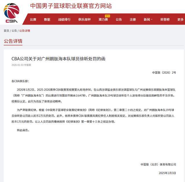 赛后,徐昕的这一挑衅行为,也是备受外界瞩目,纷纷猜测,徐昕会迟到罚单的。果不其然,在1月3日深夜,这张罚单真的来了。从CBA官方信息来看,CBA公司认定徐昕在个人进攻得分后做出挑衅性的不当手势,此行为违反了体育运动精神,决定对其处以人民币2万元的罚款。