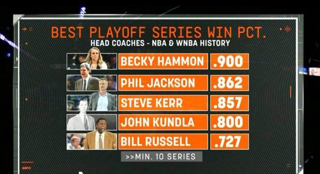 其中,王牌现任主教练贝基·哈蒙以90%的胜率位居榜首。 其余四位分别是: