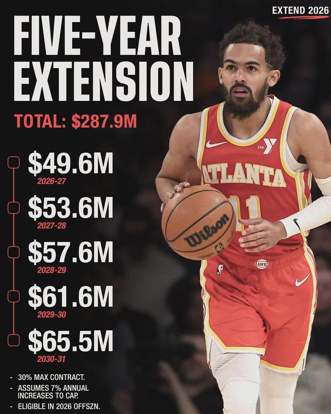 另一记者Jake Fischer表示,特雷杨目前不会申请交易,他希望等到明年夏天跟老鹰签一份更大的合同。如果特雷杨在新赛季入选最佳阵容(包括三阵),到了2026年休赛期,他最多能跟老鹰签下一份5年3.5亿美元的历史最大合同。