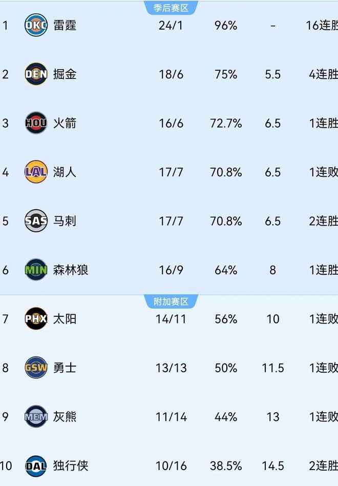 尽管文班亚马长期缺阵,马刺依然展现出了不俗的战斗力,本赛季至今以17胜7负排名西部第五,战绩和西部第四的湖人持平,仅落后西部第二的掘金1个胜场。