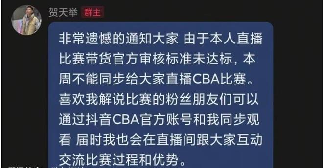 昨天贺天举在球迷粉丝群众跟大家道歉,他说“非常遗憾的通知大家,由于本人直播比赛带货官方审核标准未达标,本周不能同步给大家直播CBA比赛。”贺天举因为直播带货未达标,被抖音平台禁播,没想到作为前CBA球员改行做网络直播,做比赛直播还要带货,还要接受平台的考核,不达标就没有直播资源。作为一名有一定粉丝基础的CBA球星尚且如此,其他解说员的处境就更不用说了。