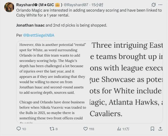 北京时间12月25日,据ClutchPoints记者Brett Siegel报道,魔术愿意交易艾萨克和次轮签,来增强进攻端的阵容深度,魔术的交易目标是公牛后卫科比-怀特。艾萨克打出了生涯最差的一个
