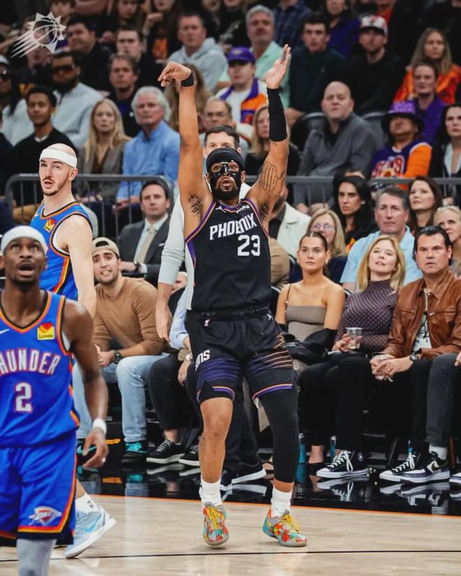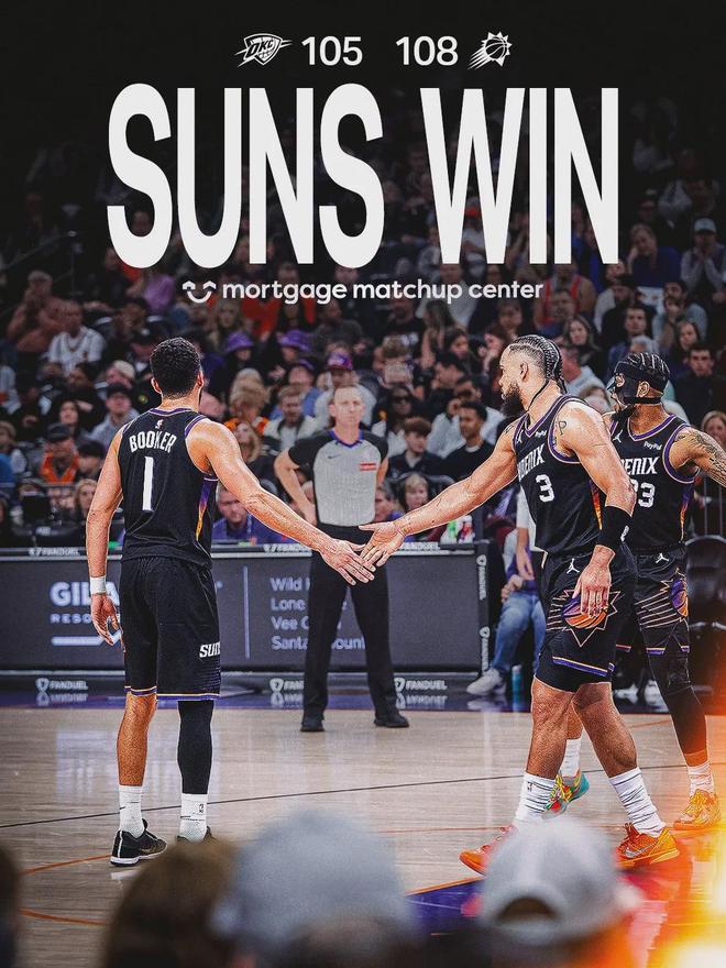雷霆最后一投三不沾,最终3分惜败。最近7场比赛,太阳6胜1负,只在客场113-129输给了骑士。今天布克首发出战38分钟,投篮11中5,三分4中1,罚球15中13,得到24分6篮板9助攻1失误3犯规,正负值+11全场第二高。