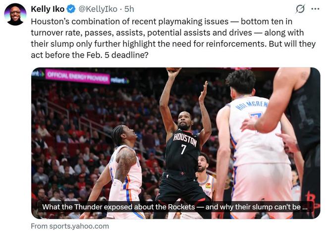 队记Kelly Iko明确表示,火箭队高层目前没有像往年那样释放出积极升级现有阵容的信号,他们不想做出过度反应。