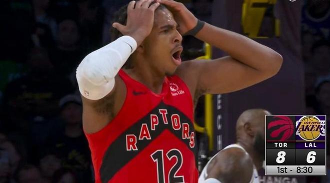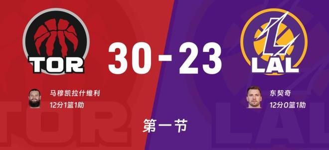 比赛开始湖人主场第一攻,东契奇三分尝试打铁,巴恩斯拿下篮板快下助攻博伊尔斯空接暴扣,斯玛特运过来中距离跳投得分,艾顿内线单打也有湖人4-2开局。双方攻防转换很快,不过失误都很多,三个回合谁也无法得分。博伊尔斯,英格拉姆接连内线得分猛龙反超2分,东契奇单打阿巴基两罚全中比分打成6-6平。巴恩斯顶投艾顿得分,詹姆斯传球失误,博伊尔斯反击顶翻东契奇打成,裁判给了进攻犯规,猛龙随即暂停挑战。回看过后挑战成功了,改成东契奇阻挡博伊尔斯加罚命中11-6猛龙领先5分,东契奇上篮接连被帽拉拉维亚三分三不沾,巴恩斯中距离拔中,东契奇抱怨裁判吃到技术犯规英格拉姆技术罚球命中14-6。詹姆斯跳投止血,巴恩斯上下步回应猛龙,马穆爆发连得12分东契奇对彪砍下8分湖人还是落后7分,暂停回来双方各得2分,这样首节打完湖人23-30落后7分!