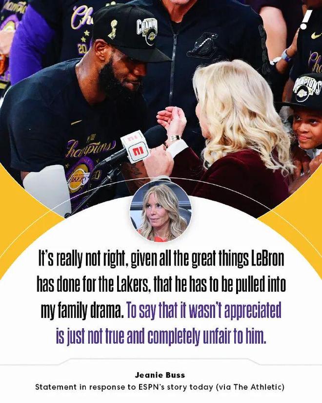 “考虑到勒布朗为湖人做出的卓越贡献,把他卷入我的家族纠纷这实在不应该。那些说他未受尊重的言论绝非事实,对他而言也完全不公平。”