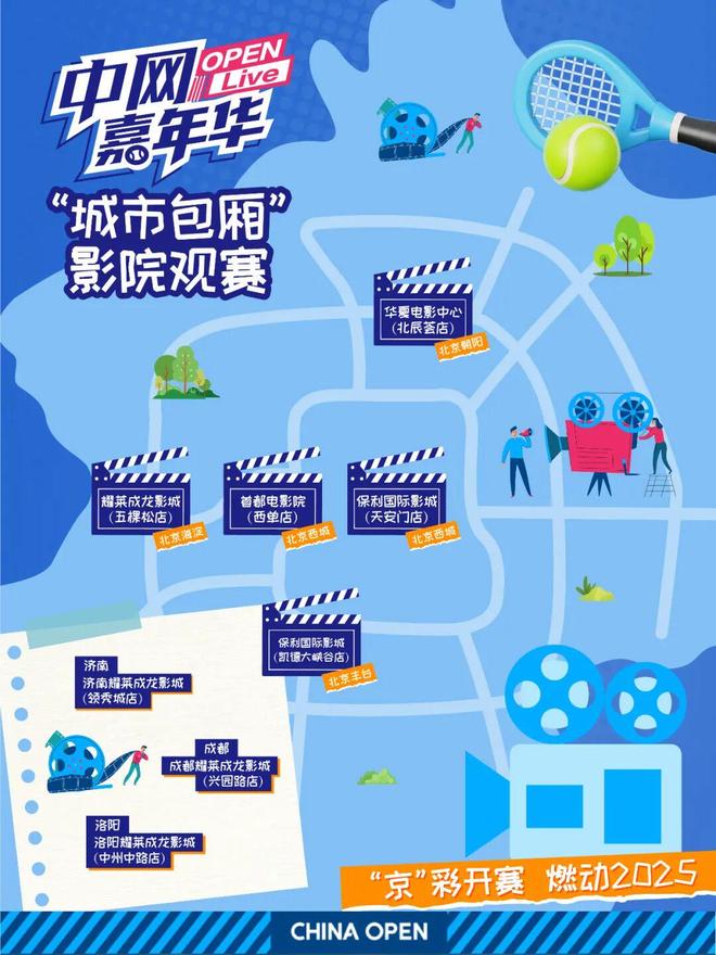 2025年9月,中国网球公开赛首次推出“中网嘉年华OpenLive第二现场”计划,以“京彩开赛,燃动2025”为口号,创新打造“观赛派对、商圈互动、影院观赛”三大模式,在全市及京外设立近4