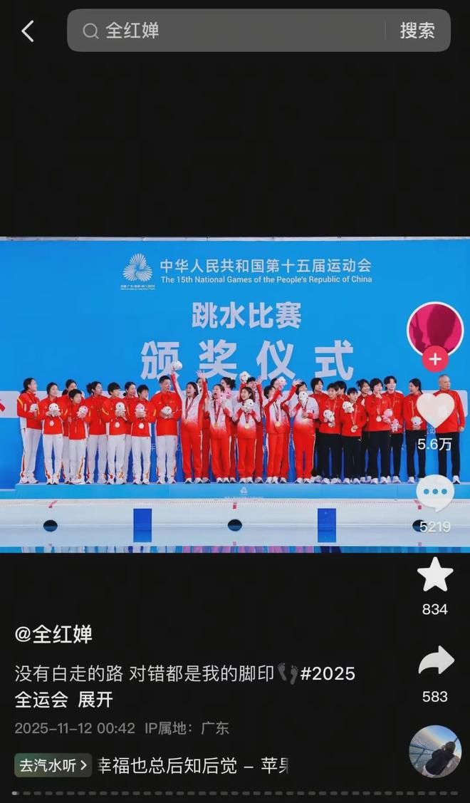 今天(11月12日)凌晨,全红婵在社交媒体平台上晒出多张十五运会现场照片,其中包括她和队友合影、颁奖仪式以及大量全运会个人花絮内容。