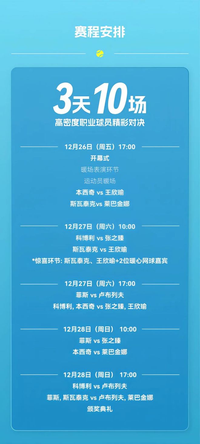 本届赛事以“你我皆是主角”为办赛主题,除了高水平高密度的网球对抗以外,还将在跨年节点为网球迷们营造多元的网球体验场景。比如举办首届大湾区“网球生活节”,包含网球文创、赛事体验、美食消费等,8位球星亲临现场,邀请全国的网球迷在深圳从圣诞节畅玩到元旦新年。另外比赛期间还会有时尚红毯秀、直播大盛典等嘉年华场景,世界球星和娱乐明星在此汇聚一堂,为中国网球迷们贡献一场无与伦比的视觉盛宴。