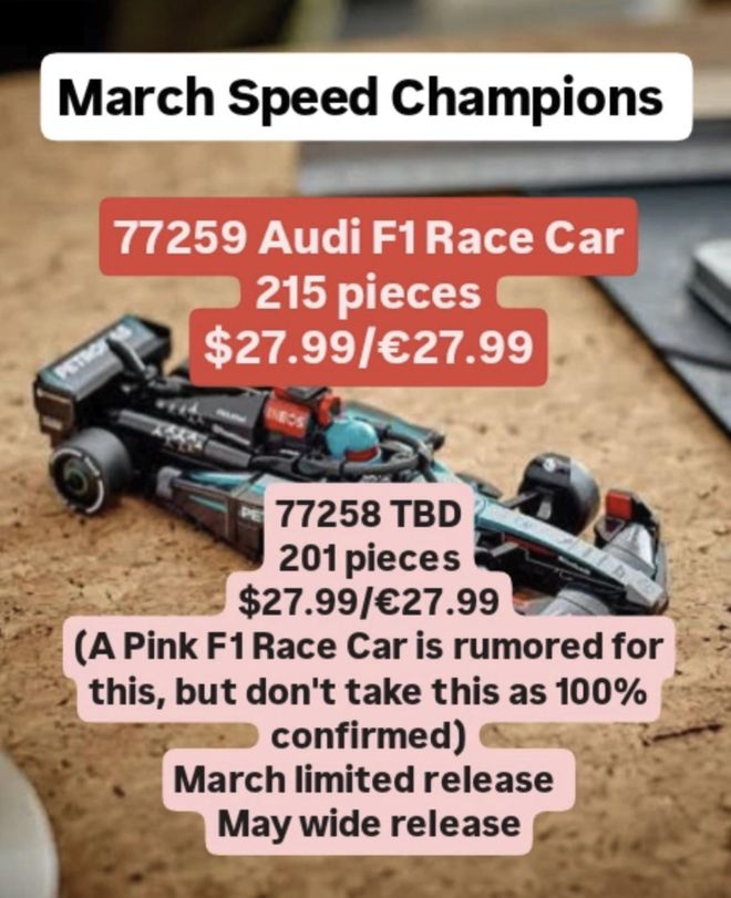 今天圈子为大家收集一下,最近几天国外媒体Bricktap分享的最新乐高情报,目前已知的都是文字情报,可信度非常高,立刻看看:77259 Audi F1 Race Car已知套装参数:零件数:215海外售价:27.