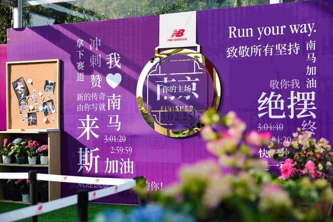 在赛前举办的“2025 南京马拉松博览会”上,New Balance 焕新亮相,为南马跑者提供专业参赛服饰与多元互动体验。展区以“Run yourway.”精神为核心,通过跑者型格测试鉴定跑者类型,并由此开启两条专属互动旅程,涵盖跑姿分析、寄语墙、姓名墙、T 恤定制与产品展示等环节,让跑者在探索自我节奏的同时,感受赛前的仪式感与期待。赛事当天,NewBalance 为官方配速员、志愿者与参赛跑者提供全方位装备支持,陪伴他们在山水城林交融的赛道上释放能量,跨越专属里程碑。终点处的完赛打卡区则为跑者记录下属于独特的“主场”时刻。