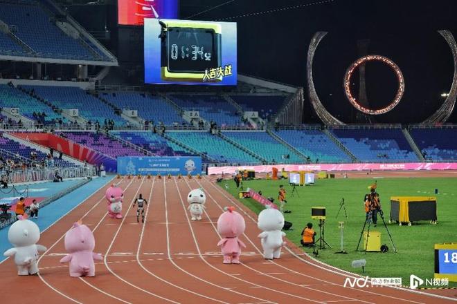 你猜谁赢了飞人大战前,十五运会吉祥物与机器人竞赛百米跑