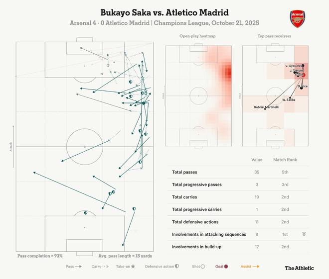 他与廷贝尔的换位配合非常犀利,让这位右后卫能够轻松参与进攻。他在防守端也同样积极。上半场中段,他已经完成了一次铲抢和两次拦截,帮助阿森纳阻止马竞组织进攻。