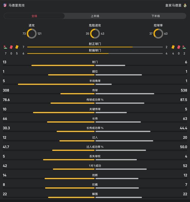 马竞vs皇马全场比赛数据:射门136,控球率37%63%