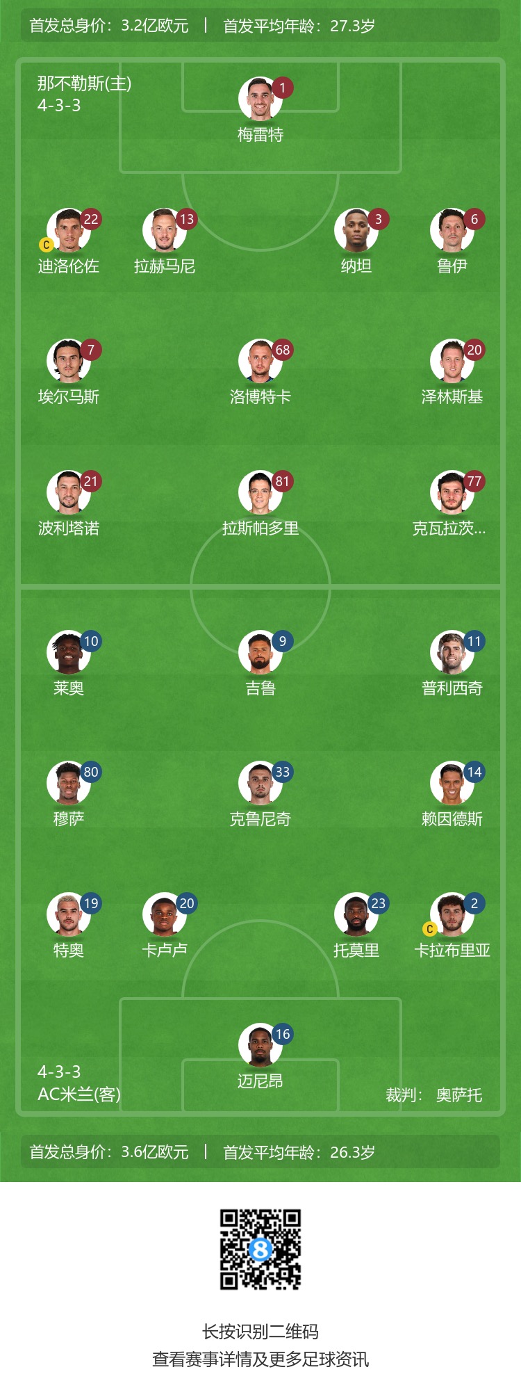 那不勒斯首发:1-梅雷特、6-马里奥-鲁伊、3-纳坦、13-拉赫玛尼、22-迪洛伦佐、68-洛博特卡、20-泽林斯基、7-埃尔马斯、21-波利塔诺、77-克瓦拉茨赫利亚、81-拉斯帕多里