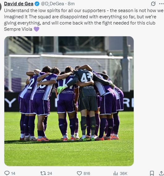 雷速体育10月6日讯 意甲第6轮,佛罗伦萨主场以1-2遭罗马逆转。在前6轮的比赛里,佛罗伦萨仅取得3平3负的战绩,迄今仍然没有取得过胜绩。比赛结束后,佛罗伦萨门将德赫亚在社媒发文,谈到球队的低迷态势。