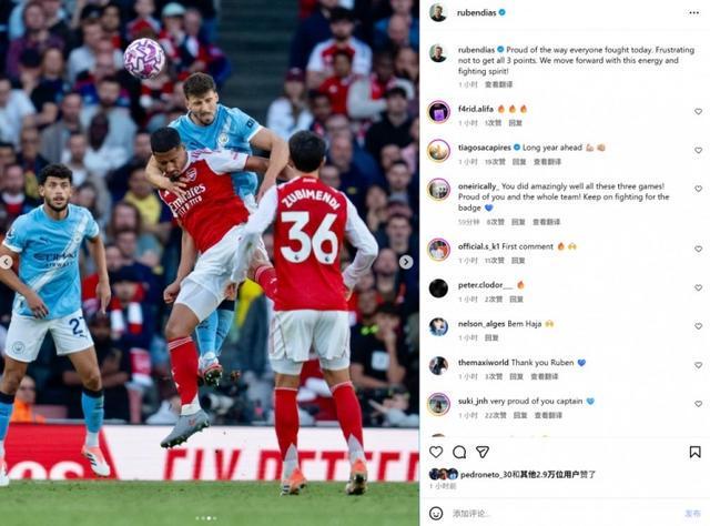 曼城球员鲁本-迪亚斯也在社媒晒出本场照片,配文写道:“为今天全队的拼搏精神感到骄傲,很失望没能拿到3分,我们带着能量与斗争精神继续前进!”