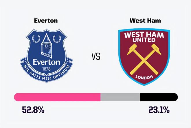 历史交锋中西汉姆联略占优势,近5次做客埃弗顿取得3胜1平1负。莫耶斯对双方都了如指掌。然而,基于本赛季的表现和主场优势,Opta超级计算机的万次模拟预测更看好埃弗顿,他们拥有52.8%的获胜概率,而西汉姆联的赢球概率仅为23.1%。