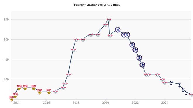2020年夏天维尔纳转会到了切尔西,当时他的身价还曾经达到7000万欧元,但此后就一路下跌,2022年夏天他回到RB莱比锡之后身价仅剩2500万欧元,2024年冬窗加盟热刺之后他的身价进一步下跌至1700万欧元。