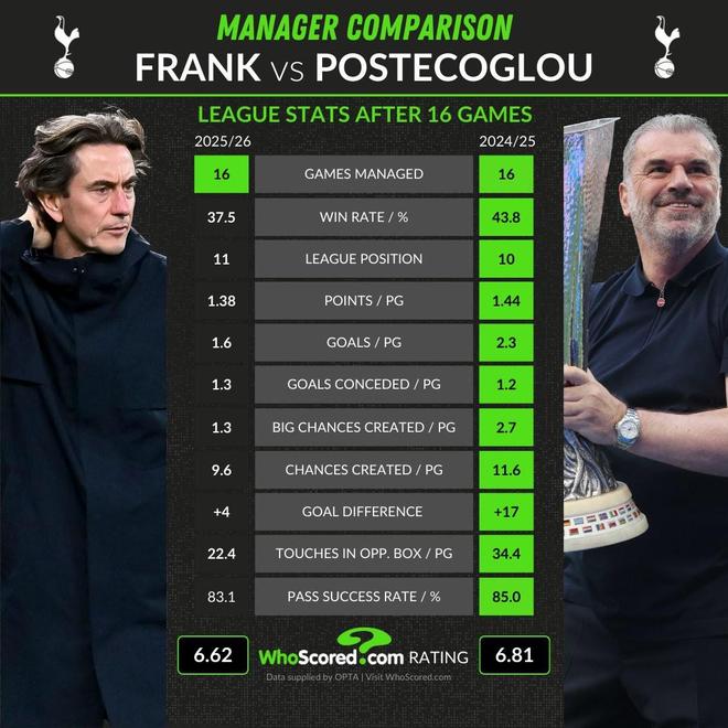 客场0-3不敌诺丁汉森林后,托马斯-弗兰克在北伦敦所承受的压力进一步加大,这赛季球队的比赛风格以及糟糕的主场战绩已经让球迷的不满情绪不断升温,Whoscored也对比了弗兰克本赛