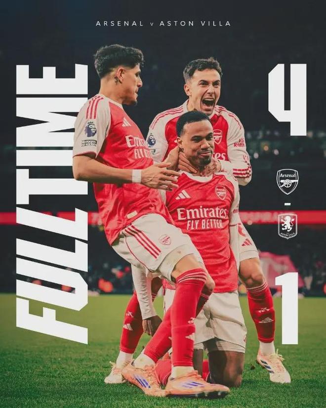 - 北京时间12月31日凌晨进行的英超第19轮较量中,阿森纳在主场火力全开,以4-1的比分战胜阿斯顿维拉,顺利拿下三分...发表于: 12-31 14:40