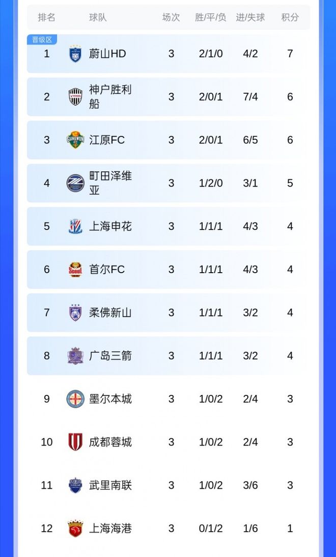 申花20首尔亚冠最新积分榜出炉申花第5蓉城第10海港倒数第1