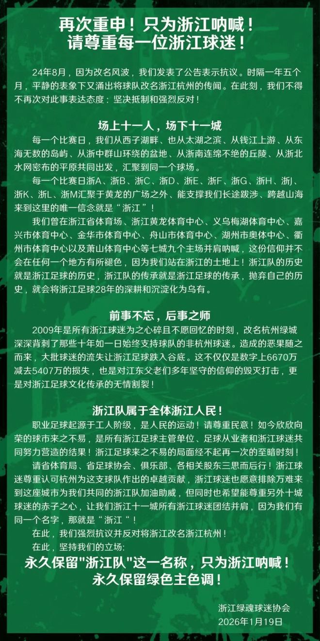 近日,有消息称中超劲旅浙江队,新赛季将更名为“浙江杭州队”。而北京时间1月19日晚,浙江队知名球迷组织“绿魂”发文以示抗议。在抗议书中,该球迷会列举了2009年的“前车之鉴”